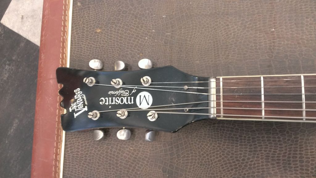 This is the guitar that got me hooked on Mosrites. Remarkably clean, plays and sounds as good as it looks. As can be seen in the photos, it's got some chips around the edge of the body. Very few other marks on the body and essentially no finish checking. It's got the classic pickguard lift by the neck pickup where the material has shrunken.
