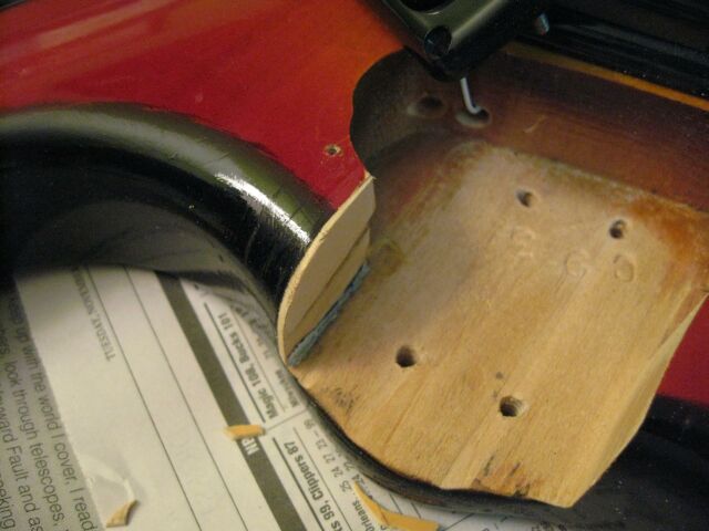 Next I wanted to fix the over-sanding I did in the neck pocket. I got a wooden shim at my local hardware store and sanded it as thin as I could. Then I glued it to the side of the neck pocket, using this high-tech apparatus to keep it in place.