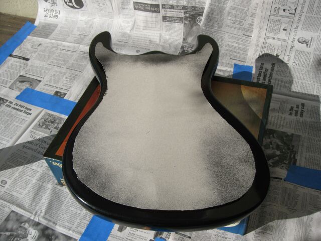 So, picking up where I left off, I wanted a smoother transition from black to red. I made a cardboard trace of the body and cut out a rough of the area where I didn't want black. Holding this an inch or so off the body while I sprayed the black allowed me to protect the center of the burst without having a solid edge to the paint. I held the can over the center of the body and painting in an outward direction, the same way I did the three color edge.